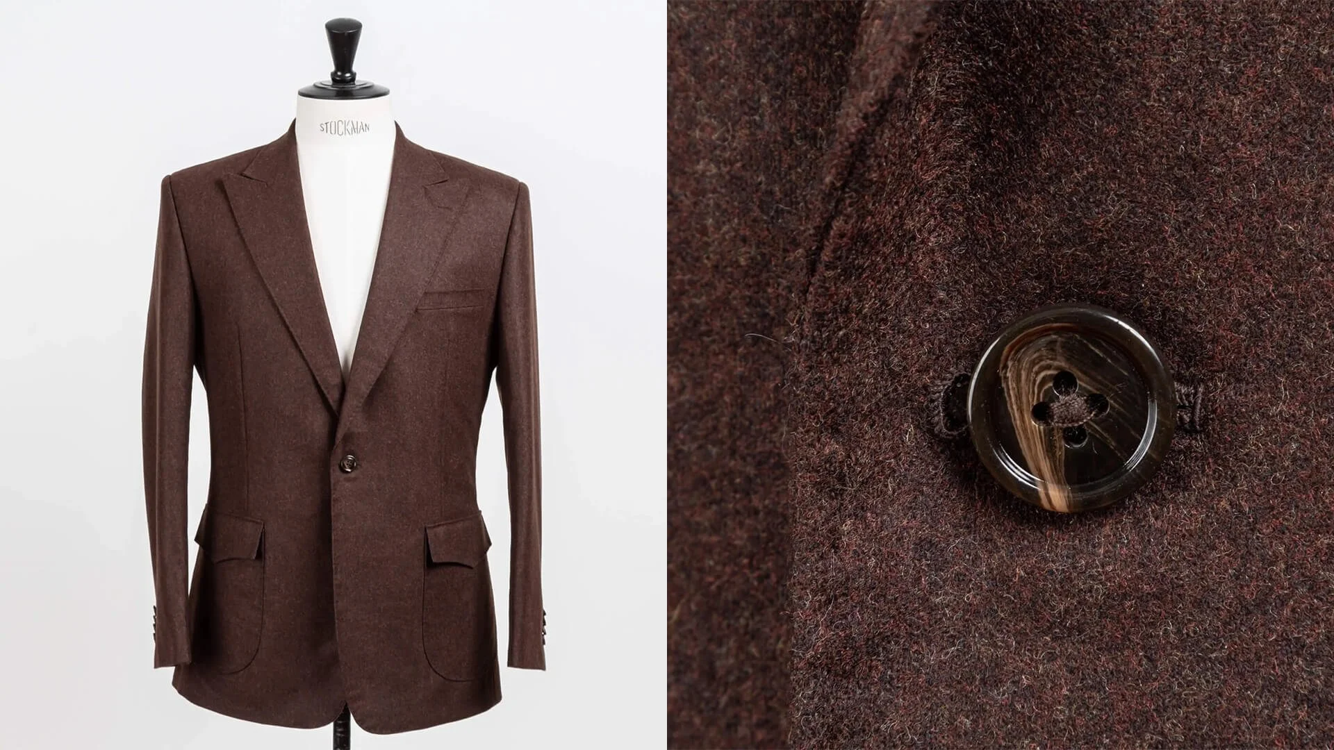 The jacket, made from super 100's wool flannel, exudes craftsmanship. The floating canvas of horsehair and the peak lapels emphasize the attention to quality and fit.